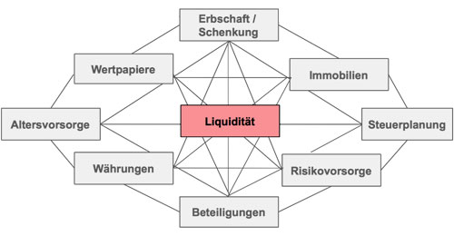 Eine professionelle, marktführende Finanzplanungssoftware unterstützt mich bei der Erfassung, Analyse und Planung Ihrer Finanzdaten. Wie nachfolgende Grafik aufzeigt, sind bei der anschließenden Umsetzung der Finanzstrategie viele Aspekte (wie z.B. Steuerplanung, Altersvorsorge) zu berücksichtigen. Dabei ist stets darauf zu achten, daß - auch auf der Grundlage eines Vorsichtsszenarios - ausreichend Liquidität vorhanden ist.